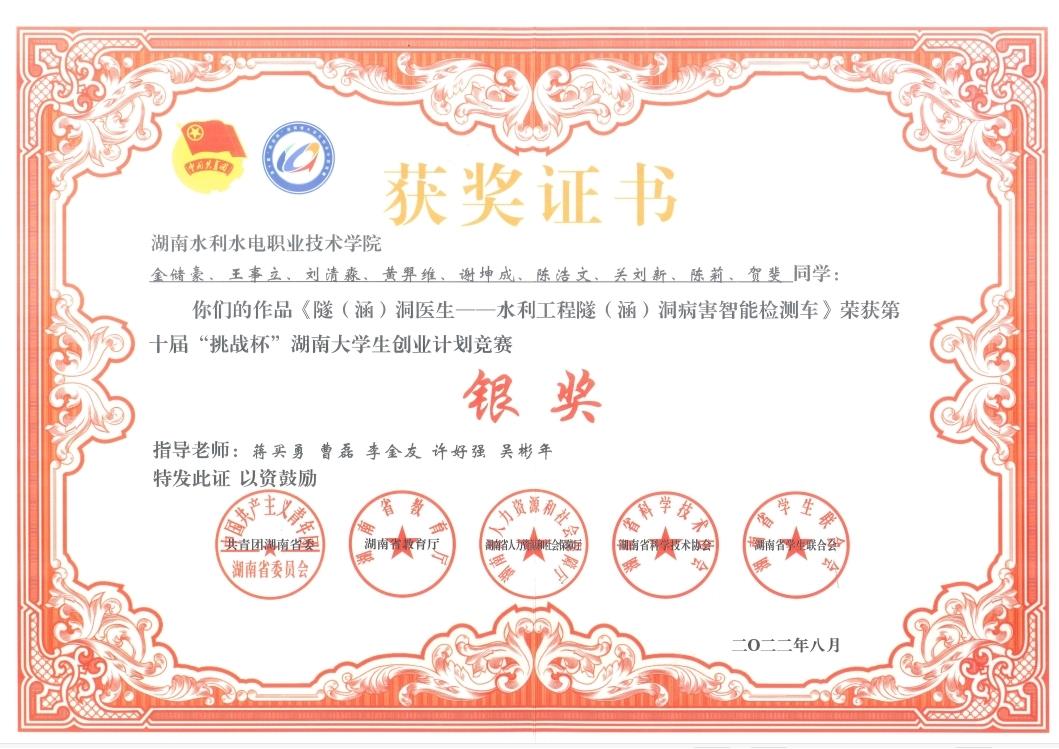 2023年11月11日,湖南水利水电职业技术学院水利工程智慧管养师生团队《水利工程隧(涵)洞病害智能巡检装置与分析系统》项目获第十八届“振兴杯”全国青年职业技能大赛学生组创新创效专项赛银奖。在此之前,该团队以《犬木塘水库工程复杂地质环境输水工程安全运行管理关键技术研究》、《水工隧(涵)洞病害智能检查诊断技术研究》等两项重大科技项目攻关为载体,先后参加中国国际“互联网+”、“振兴杯”等创新创业大赛,其中《涵禹号——水利工程隧(涵)洞病害智能诊断服务的“逆行者》获省赛二等奖1项,并入围国赛。