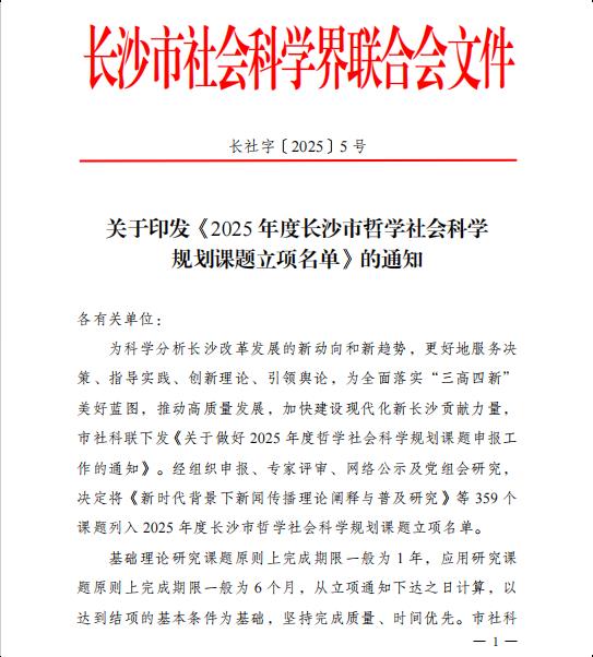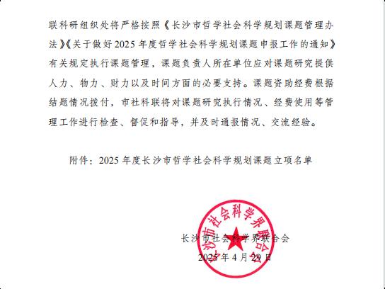 近日,长沙市社会科学界联合会公布了2025年度长沙市社科联课题立项名单,我校共计获批立项10项,其中基础类7项,应用类3项。