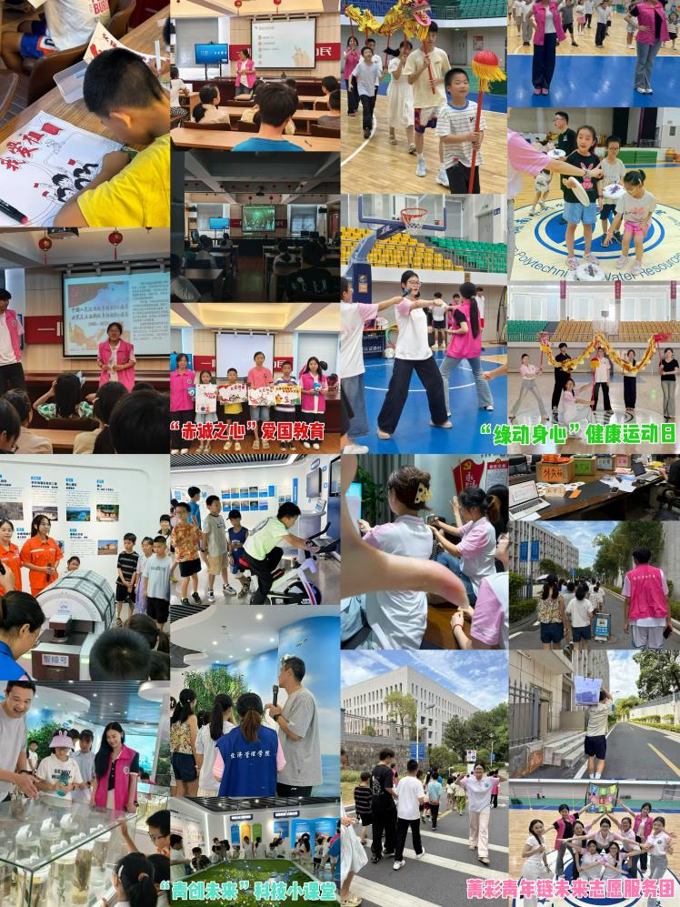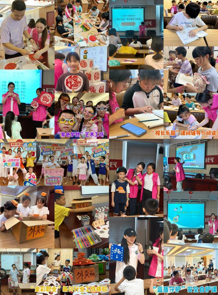 活动期间,“橙长乐园”开展个性化课业辅导和绘本故事会,志愿者耐心讲解、温情陪伴,助力孩子们学业进步;“紫艺梦想”艺术工坊带领孩子们体验剪纸、扭扭棒手工,在传统与创意中感受非遗魅力;“赤诚之心”红色主题教育通过观影和分享,激发孩子们的爱国情怀;“蓝盾守护”安全课堂则以情景模拟等方式,提升孩子们的反诈、交通和防溺水自护能力。“金彩职业”体验让孩子们化身“小小外卖员”和“小小主播”,在趣味互动中理解父母工作的辛勤与价值;“青创未来”科技课堂依托我校水情馆及数字资源,拓展孩子们对现代科技的认识;而“绿动身心”健康日则将传统拳操、舞龙与现代体育游戏相结合,锤炼体魄的同时,更凝聚了孩子们的团队精神。