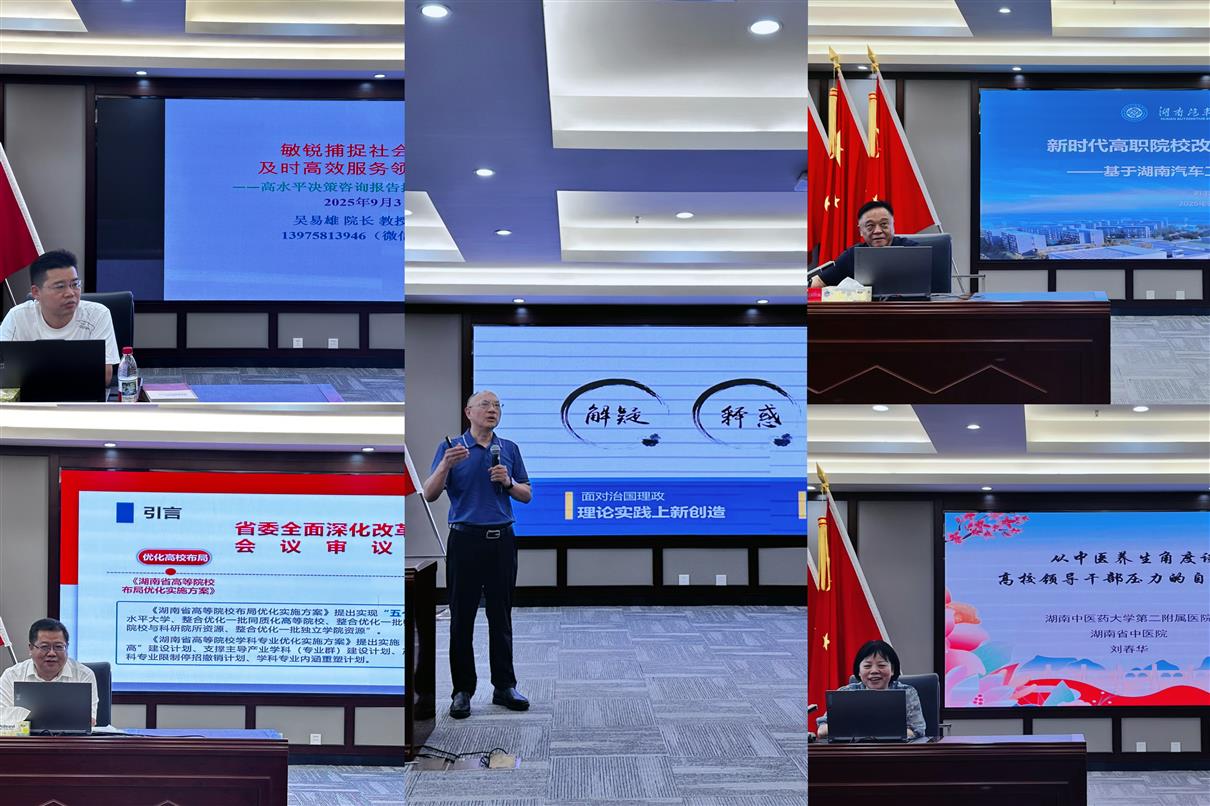 怀化学院中国数字农业农村研究院院长吴易雄教授结合自身丰富的政策研究和决策咨询经验,从报告类型、选题要求、主题确立、撰写范式、行文技巧、报送渠道、案例分析等七个维度系统讲解了高水平决策咨询报告撰写方法与技巧湖南工业大学马克思主义学院李正军教授“是何”“有何”“为何”“何为”四个方面系统阐述了新时代加强高校领导干部政治能力建设的核心要义和实践要求湖南省教育科学研究院党委副书记、纪委书记陈拥贤教授以大力弘扬教育家精神 加快建设教育强国为题作专题报告报告紧扣党的二十大教育强国战略,深入阐释了建设教育强国的总体要求、目标任务、路径措施及对职业教育发展的新要求湖南汽车工程职业大学原党委书记、职业教育专家、邓志革教授立足该校办学实践,提出新时代高职院校改革创新的三大着力点:优化专业布局,调整专业结构;强化队伍建设,深化产教融合;提升关键能力,推进数字赋能。湖南中医药大学第二附属医院党委副书记、院长刘春华教授引经据典、深入浅出,中医养生整体观治未病的核心理念为高校领导干部开出一张“自我调适处方”,现场示范实用养生技巧,引发了参训学员的广泛共鸣和积极互动。