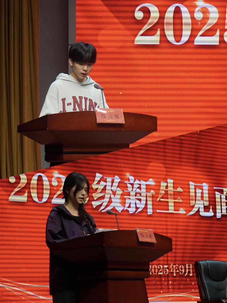 2024级大数据技术二班徐睿杰作为在校生代表发言。他结合两年来的学习经历,以电影《浪浪山小妖怪》为引,提出“理想”“奋斗”“温情”三座“浪浪山”,勉励学弟学妹成为有情怀、有情操、有情义的新时代青年。2025级云计算一班何湘怡作为新生代表,表达了对学院领导、老师及学长学姐的感谢,并承诺将在明德修身与技能提升上持续努力,用智慧与汗水书写无悔的青春答卷。