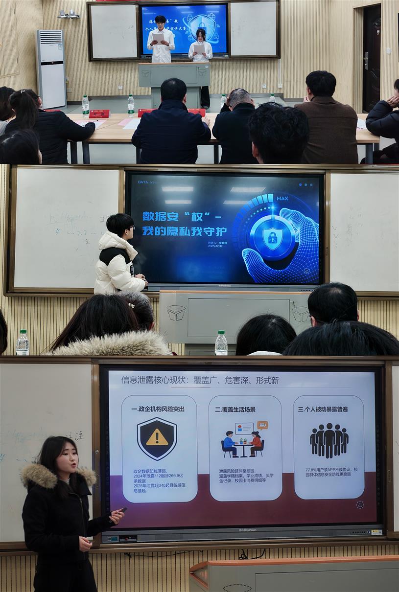 活动自启动以来,历经宣传报名、初赛筛选、决赛角逐及成果展示四个阶段。参赛学生紧扣主题,或独立创作,或组队协作,从多元视角展开精彩阐释。在初赛阶段,选手们提交了构思精巧、内容扎实的PPT作品与演讲视频。入围决赛的队伍更是在现场展现了极高的专业水准与表达能力,他们或从技术视角剖析密码安全、社交工程攻击的防范,或从伦理视角审视大数据算法的偏见与边界,或结合校园真实案例解读法律条文,亦或展望隐私计算等前沿技术的未来图景,为现场观众与评委呈现了一场思想与知识的盛宴。