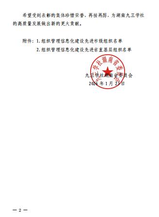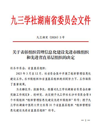 近日,九三学社湖南省委员会发布《关于表彰组织管理信息化建设先进市级组织和先进省直基层组织的决定》(九三湘发〔2026〕3号),对在2025年组织管理信息化建设中表现突出的集体予以表彰。我校九三学社支社荣获“组织管理信息化建设先进省直基层组织”荣誉称号