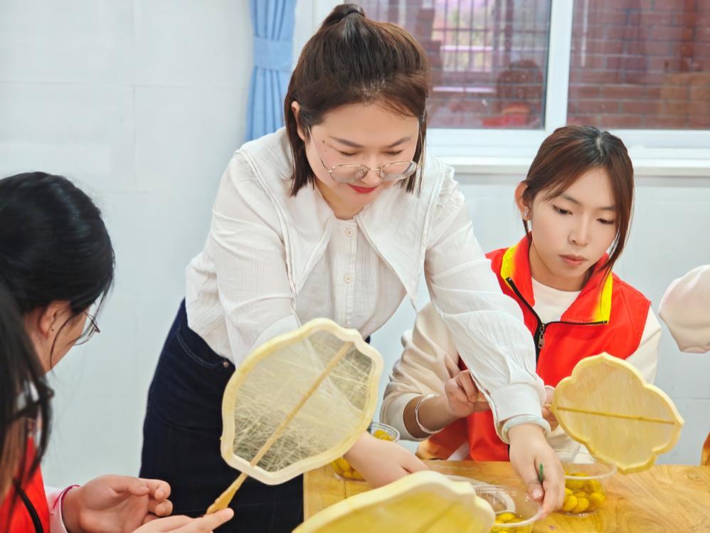 非遗体验环节,大元中心小学彭思琪副校长、汪海燕主任亲自指导,带领志愿者与孩子们沉浸式感受蚕桑文化的独特魅力。从蚕桑历史渊源到蚕丝特性,再到蚕丝扇的制作技艺,老师们手把手细致指导。志愿者们从最初手法略显笨拙、难以掌握轻薄蚕丝的章法,到在老师耐心指导下逐渐熟练,指尖翻飞间,缕缕蚕丝化作精致灵动的蚕丝扇。每一把成品扇,既承载着非遗文化的千年底蕴,也凝聚着志愿者们亲手实践的匠心与温度。